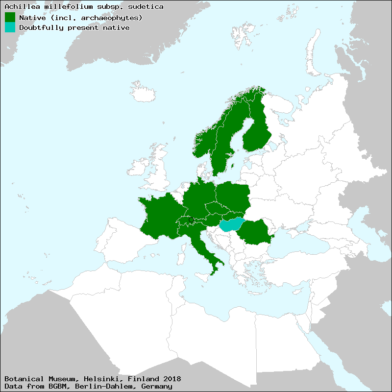 Achillée alpestre (French), Achillée des monts Sudètes (French), Fjällröllika (Swedish), Gebirgs-Schafgarbe (German), Krwawnik sudecki (Polish), Luddröllika (Swedish), Řebříček obecný sudetský (Czech), Rebríček obyčajný alpínsky (Slovak), Sudeten-Schafgarbe (German)[Credits] |