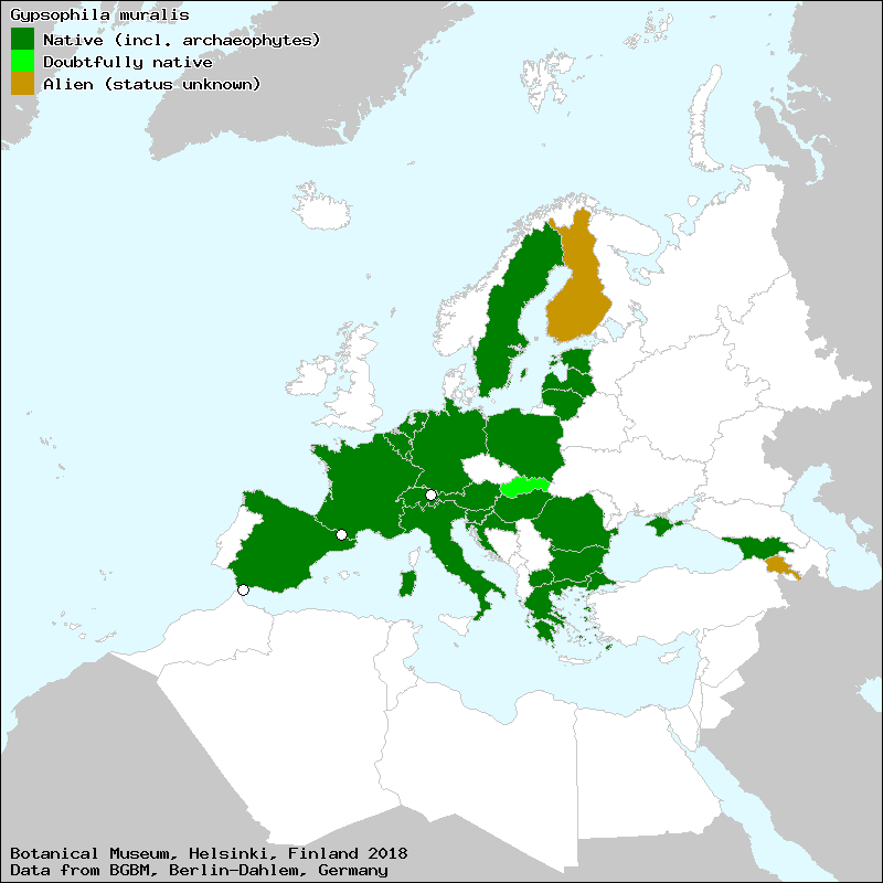 Acker-Gipskraut (German), dirvinė guboja (Lithuanian), Gipskruid (Dutch), Gipsofila minuta (Italian), gipsòfila mural (Catalan), Gipsówka polny (Polish), grusnejlika (Swedish), gypsomilka múrová (Slovak), Gypsophile des murailles (French), ketoraunikki (Finnish), Łyszczec polny (Polish), Mezei fátyolvirág (Hungarian), Mur-Gipsurt (Danish), murslør (Norwegian), mūru ģipsene (Lithuanian), Müür-kipslill (Estonian), Pozidna sadrenka (Slovene), šater zední (Czech), Vălul miresei (Roumanian), zidna sadarka (Croat), Γυψόφιλον το επιτοίχιον (Greek), Гипсорицэ постенная (Moldovian), Диваркәнары чоған (Azerbaijani), качим постенный (Russian), Стенна мишорка (Bulgarian)[Credits] |