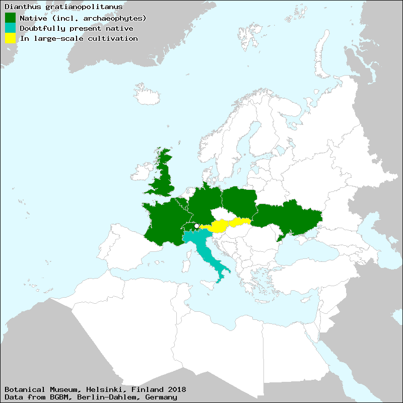 Oeillet bleu (French), Oeillet bleuâtre (French), Oeillet de Grenoble (French), Cheddar Pink (English), Garofano di Grenoble (Italian), Goździk siny (Polish), Grenobler Nelke (German), hvozdík sivý (Czech), klinček sivý (Slovak), Oeillet de Grenoble (French), Pfingst-Nelke (German)[Credits] |