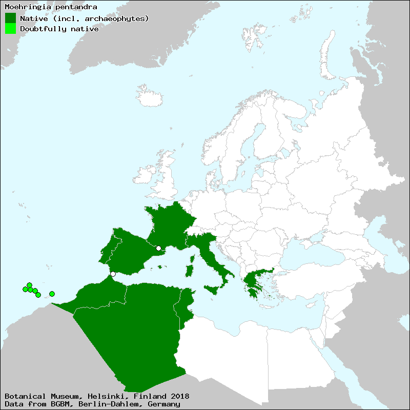 Sabline à cinq étamines (French), arenària pentandra (Catalan), Moehringie à cinq étamines (French), Μοιριγγία η πέντανδρος (Greek)[Credits] |