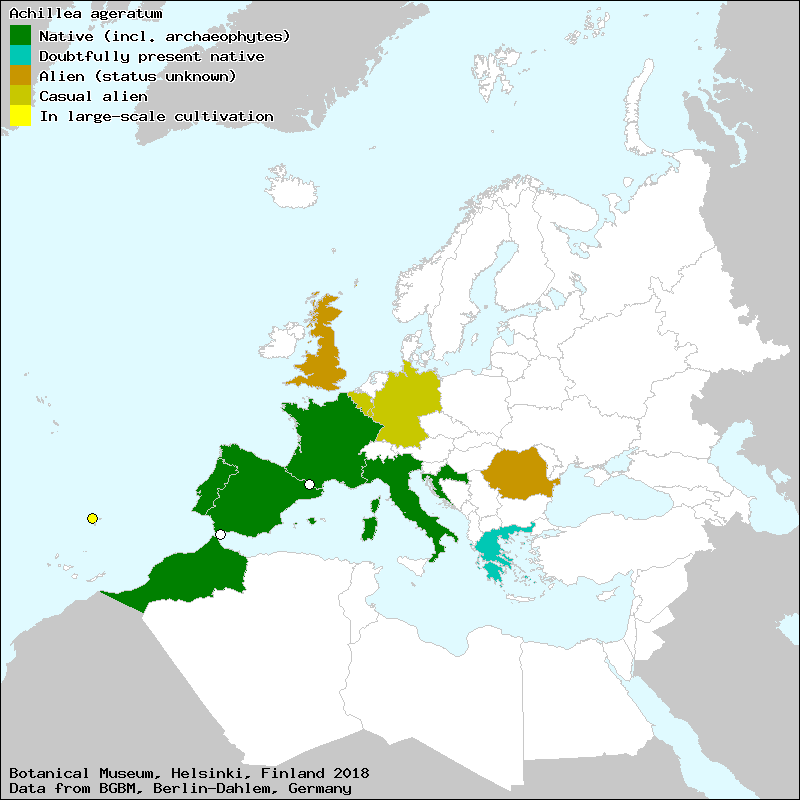 Achillée à feuilles d’Agératum (French), Achillée visqueuse (French), Millefoglio agerato (Italian), Piknjasti jezičac (Croat), Slavljika (Croat), Slobodnik (Croat), Trava julia (Croat), Zelje rusno (Croat), achillea de Sam Joaô (Portuguese), Achillée Agératum (French), agerat (Catalan), agèrat (Catalan), agerato (Portuguese), agerato (Spanish, Castillian), alé de bou (Catalan), alè de bou (Catalan), ale de bou (Majorcan), algerato (Spanish, Castillian), alta-reina (Catalan), altareina (Spanish, Castillian), altareyna (Catalan), altareyna (Spanish, Castillian), altarreina (Spanish, Castillian), árnica (Spanish, Castillian), artemisa basta (Spanish, Castillian), artemisa real (Spanish, Castillian), artemisia basta (Spanish, Castillian), balsamina (Galician), cabaretes (Aragonese), cabaretes (High Aragonese), camamila (Aragonese), camamila (High Aragonese), camamila (Spanish, Castillian), erva de Sam Joaô (Portuguese), erva-copada-de-Sâo-Joâo (Portuguese), erva-de-Sâo-Joâo (Portuguese), erva-de-Sâo-Joâo-de-Grisley (Portuguese), Eupatoire de Mésué (French), eupatorio de Mesué (Portuguese), eupatorio de Mesué (Spanish, Castillian), eupatório-de-Mesué (Portuguese), herba balsamina (Galician), herba da beurra (Galician), herba do armado (Galician), herbolan (Spanish, Castillian), herva copada de Sam Joaô (Portuguese), herva de Sam Joaô (Portuguese), herva Julia (Portuguese), hierba cabezona (Aragonese), hierba julia (Spanish, Castillian), hierbajulia (Spanish, Castillian), ierba cabezona (Aragonese), julia (Portuguese), macela do S. Joâo (Portuguese), macela francesa (Portuguese), macela-de-sâo-joâo (Portuguese), macela-do-Sâo-Joâo (Portuguese), macela-francesa (Portuguese), macella de Sam Joaô (Portuguese), macella franceza (Portuguese), marcella franceza (Portuguese), seguidilla (Majorcan), yerba cabezona (High Aragonese), yerba Julia (Spanish, Castillian)[Credits] |