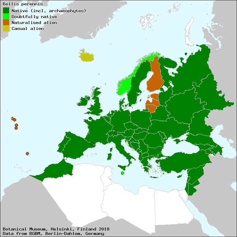 Ausdauerndes Gänseblümchen (German), Cvetiče ledinsko (Croat), Daisy (English), Fior di curona (Corsican), Harilik kirikakar (Estonian), Iskrica (Croat), Jaglikovina (Croat), Katarinčica (Croat), Kaunokainen (Finnish), Klobučac (Croat), Luleshqerrë shumëvjeçare (Albanian), Madeliefje (Dutch), Margheritina (Italian), Massliebchen (German), Navadna marjetica (Slovene), Obična tratinčica (Croat), Pâquerette vivace (French), Pâquerette (French), Pratelina (Corsican), Pratolina comune (Italian), Primavera (Italian), Pytter (Swedish), Sedmikráska obecná (Czech), Sedmokráska obyčajná (Slovak), Stokrotka pospolita (Polish), Tusenfryd (Norwegian), Tusensköna (Swedish), Tusindfryd (Danish), Маргаритка многолетняя (Russian), Многогодишна паричка (Bulgarian), Перелуцэ перенэ (Moldovian), Стокротки багаторiчнi (Ukraine), Чохиллик гызчичәји (Azerbaijan), Մարգարտածաղիկ բազմամյա (Armenian), חִנָּנִית רַב-שְׁנָתִית (Israel (Hebrew)), بِـلّيس مُعَمِّر (Arabic), basabitxilore (Euskera), bella margarita (Spanish, Castillian), Bellis (Swedish), bellis menor (Spanish, Castillian), bellorita (Aragonese), bellorita (Spanish, Castillian), belorita (Galician), ben me quer (Galician), bichilora (Euskera), biloreta (Galician), bilorita (Galician), bilorita (Portuguese), bitxilorea (Euskera), bonina (Galician), bonina (Portuguese), butxa (Euskera), catasola (Asturian), chiribita (Spanish, Castillian), chiriva (Spanish, Castillian), chirivas (Spanish, Castillian), chirivita (Spanish, Castillian), chirivitas (Spanish, Castillian), Chudobka (Czech), consolida menor (Spanish, Castillian), consuelda menor (Spanish, Castillian), flor de Alejandría (Spanish, Castillian), flor de gatu (Asturian), flor de primavera (Asturian), flor de San Juan (Asturian), gamarza (Spanish, Castillian), gramaza (Spanish, Castillian), gramazón (Spanish, Castillian), hierba del buenaliento (Spanish, Castillian), Ilggadīgā mārpuķīte (Latvian), manzanilla (Galician), margalida (Majorcan), margalideta (Catalan), margalideta (Majorcan), margalideta (Valencian), margarida (Catalan), margarida (Galician), margarida (Portuguese), margarida (Spanish, Castillian), margarida-dobrada (Portuguese), margarides (Catalan), margarides bordes (Catalan), margarideta (Catalan), margarideta (Valencian), margarideta blanca (Valencian), margaridoia (Catalan), margaridoia (Valencian), margaridoia perenne (Catalan), margaridoies (Catalan), margaridolla (Catalan), margaridoya (Catalan), margarita (Asturian), margarita (Galician), margarita (Portuguese), margarita (Spanish, Castillian), margarita común (Spanish, Castillian), margarita de prados (Spanish, Castillian), margarita menor (Spanish, Castillian), margarita rasteira (Portuguese), margarita silvestre (Spanish, Castillian), margaritas (Spanish, Castillian), margaritas de prado (Spanish, Castillian), margaritina (Spanish, Castillian), margaritines (Asturian), María (Spanish, Castillian), marzas (Spanish, Castillian), maya (Spanish, Castillian), maya borracha (Spanish, Castillian), maya colorada (Spanish, Castillian), mayas (Spanish, Castillian), mitxolote (Euskera), mitxoloti (Euskera), mogigato (Spanish, Castillian), ostaika (Euskera), ostaisea (Euskera), ostaiska (Euskera), parramina (Galician), pascueta (Catalan), pascueta (Spanish, Castillian), pasqüeta (Catalan), perpetua (Majorcan), petxilote (Euskera), pitxoleta (Euskera), pixallit (Catalan), ponmerendas (Galician), primachorro (Galician), primavera (Asturian), primavera (Majorcan), primavera de prados (Spanish, Castillian), rosa (Spanish, Castillian), rosa blanca (Spanish, Castillian), solda menor (Portuguese), tornasoles (Asturian), vellorita (Spanish, Castillian), velorita (Galician), velorita (Portuguese), velorita (Spanish, Castillian), vichaya (Spanish, Castillian), vilorita (Galician), vilorita (Portuguese), viroleta (Spanish, Castillian), yerba de las perlas (Spanish, Castillian), yerba-margarita (Spanish, Castillian)[Credits] |