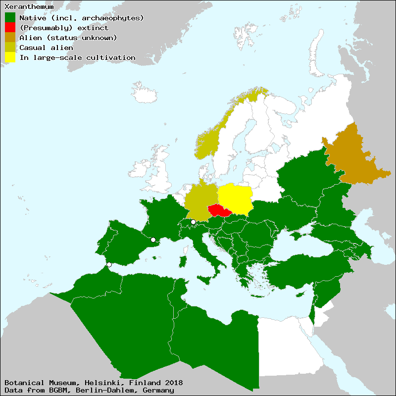 Kserantemë (Albanian), Pappersblomster (Swedish), Perpetuini (Italian), Strohblume (German), Suchokwiat (Polish), Xéranthème (French), Безсмертки (Ukraine), Безсмъртниче (Bulgarian), Плевзицэ (Moldovian), Сүпүрҝәоту (Azerbaijan), Сухоцвет (Russian), Անմեռուկ (Armenian), Չորաբույս (Armenian), יבשוש (Israel (Hebrew)), יַבְשׁוּשׁ (Israel (Hebrew)), حَنْوَة (Arabic)[Credits] |
