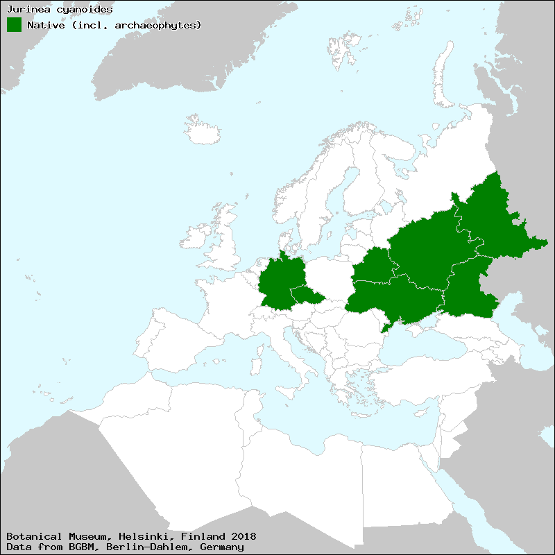 Sand-Silberscharte (German), Sinokvět chrpovitý (Czech), Юринея волошковидна (Ukraine), Юринея несправжньоволошковидна (Ukraine), Юринея харкiвська (Ukraine)[Credits] |