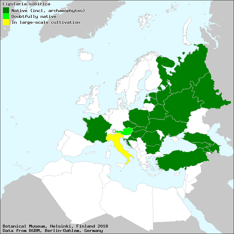 Harilik kobarpea (Estonian), Jazyčník sibírsky (Slovak), Języczka syberyjska (Polish), Ligulaire de Sibérie (French), Séneçon de Sibérie (French), Sibīrijas mēlziede (Latvian), Бузульник сибирский (Russian), Сибир лигуларија (Azerbaijan), Сибирски див тютюн (Bulgarian), Լեզվուկ սիբիրյան (Armenian)[Credits] |