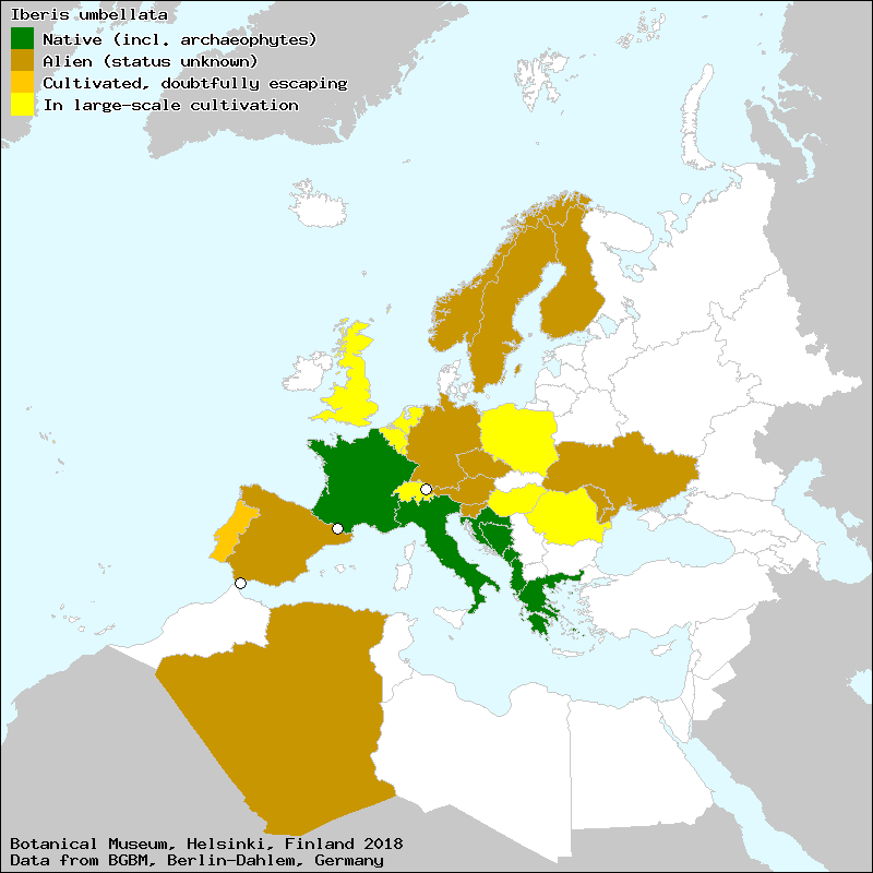 assembleias (Portuguese), assemoleas (Portuguese), carraspic (Catalan), carraspiga (Majorcan), carraspique (Galician), carraspique (Spanish, Castillian), carraspique (Valencian), carraspique blanco (Spanish, Castillian), carraspique morado (Spanish, Castillian), carraspitja (Catalan), copa de Creta (Spanish, Castillian), erva cristaleira (Portuguese), esclavina rosada (Spanish, Castillian), españoleta (Spanish, Castillian), iberide umbelada (Portuguese), Iберiйка зонтична (Ukraine), mirambell de flor (Catalan), pinito de flor (Spanish, Castillian), thlaspio dos jardins (Portuguese), tlaspi dos jardins (Portuguese), zarapico (Spanish, Castillian), Иберийка зонтичная (Russian), Лимба Мэрий умбелатэ (Moldovian)[Credits] |