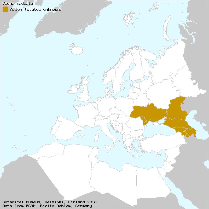 In "Flora URSS", "Flora of Cultivated Plants", Introduced to japan from India., Kept separate from V.mungo for convenience., Of ancient origin in SE Asia., Recently introduced to research stations on the Mascarenes (Polhill, 1990)., Scarcely different from V.mungo but produce different crops. |