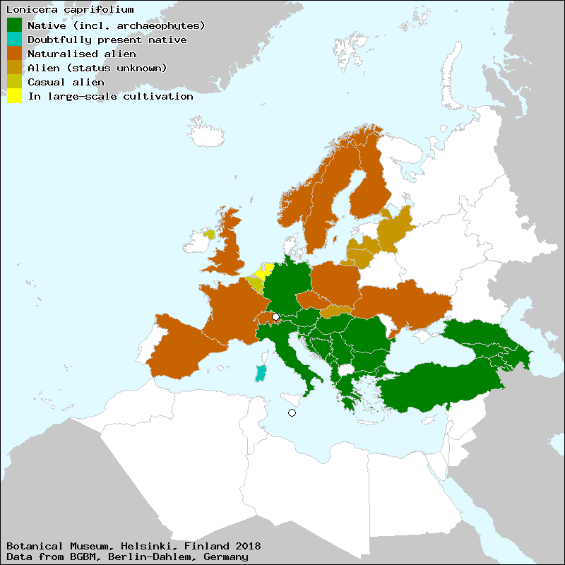 atxapar perfoliatu (Euskera), auntz-osto (Euskera), bayuba (Galician), bermigarcía (Euskera), cabrifolia (Galician), cadrifolio (Galician), caprifolio (Spanish, Castillian), chuchamel (Portuguese), chupamel (Portuguese), chupamiel (Spanish, Castillian), corriola (Galician), dolçamel (Catalan), dolçamel de jardí (Catalan), dolsamel (Catalan), escornacabras (Galician), ezker-aien (Euskera), gallets (Catalan), gaudaña (Galician), gavarrera (Valencian), lligabosc (Catalan), lligabosc (Valencian), lligabosc de jardí (Catalan), madreselva (Spanish, Castillian), madreselva común (Spanish, Castillian), madreselva horadada (Spanish, Castillian), madreselva morisca (Spanish, Castillian), madreselva perfoliada (Spanish, Castillian), madresilva (Galician), madresilva (Portuguese), madresilva das seves (Portuguese), madressilva (Portuguese), madressilva-dos-jardins (Portuguese), madresylva (Portuguese), madresylva caprina (Portuguese), madriselva (Valencian), maniselva (Valencian), maniselva de bosch (Valencian), mare del bosch (Catalan), mareselva (Catalan), mareselva de jardí (Catalan), pata de cabra (Spanish, Castillian), rodillera (Galician), salgueira (Galician), saltaseves (Galician), subideira (Galician), suegra y nuera (Spanish, Castillian), sugamel (Galician), sugames (Galician), xuclamel (Catalan)[Credits] |