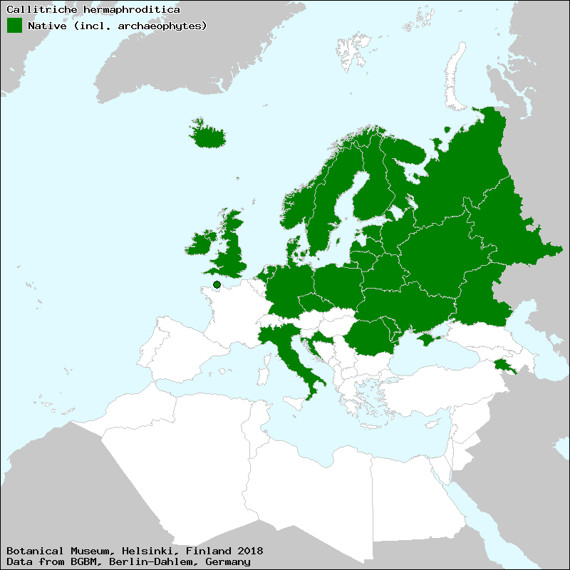 Uotila, P. (2017+): Callitriche. – In: Euro+Med Plantbase - the information resource for Euro-Mediterranean plant diversity. This work is licensed under a Creative Commons Attribution-ShareAlike 3.0 Unported license (CC-By-SA-3.0 Unported).
