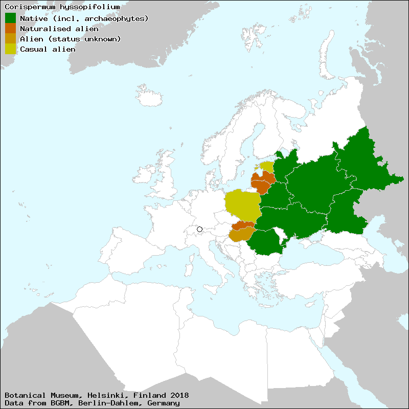 gaubtažiedis drugialaišis (Lithuanian), izoplapu kamieļzāle (Latvian), lisop-lurssvili (Estonian), Wrzosowiec hyzopolistny (Polish), Κορίσπερμον το υσσοπόφυλλον (Greek)[Credits] |