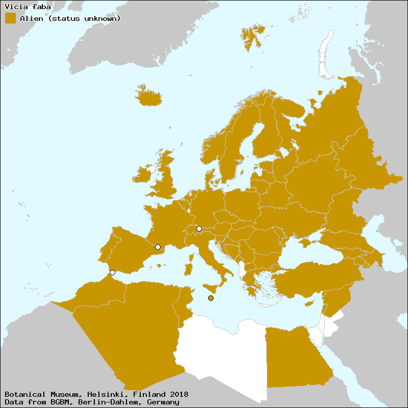 Cultivated in the Mascarenes., Favism is fairly common in the Mediterranean area., Ingestion of raw material causes Favism, a haemolytic anaemia., Most of authors treated this species as Vicia faba, Once an individual is sensitized attacks can occur from inhaling pollen., Probably originates from West Asia. Cultivated. |