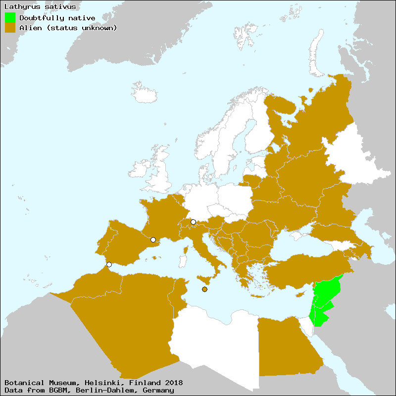 (Minusinsk vicinities - Petrova, 1930), Chita Province (Yamkun of, Alien to Siberia: Novosibirsk Province (Novospassk), Krasnoyarski Krai, An ancient Old World cultigen. Wild origin unknown., Closely related to L. sativus, EravninskiUezd, Sosnovo-Ozerskoe), Gazimuro-Zavodski Distr.- L.Sergievskaya, 1951), Buryatia (old record from, Germplasm available at Vicieae Collection(Reading),Gatersleben & Vavilov Inst., Interspecific crossing reported with Lathyrus amphicarpos., Intraspecific crossing, breeding and viability reported by Yunus & Jackson., Introduced to Britain as bird seed., Native of India, introduced to Java in trials., Perhaps one of the first crops to be domesticated in Europe. |