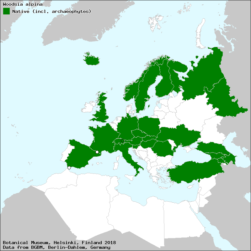 Alpen-Wimpernfarn (German), Alpine Woodsia (English), Woodsia des Alpes (French), Woodsie des Alpes (French), Alpen-Wimpernfarn (German), alpska vudsovka (Slovene), Felcetta alpina (Italian), fjallaliðfætla (Icelandic), fjällhällebräken (Swedish), Fjeld-Frynsebregne (Danish), fjell-lodnebregne (Norwegian), Havasi szirtipáfrány (Hungarian), kapradinka alpínská (Czech), Rozrzutka alpejska (Polish), tunturikiviyrtti (Finnish), Vudsia alpínska (Slovak), Woodsia des Alpes (French), алп вудсия (Azerbaijan), вудсiя альпiйська (Ukraine), вудсия альпийская (Russian)[Credits] |
