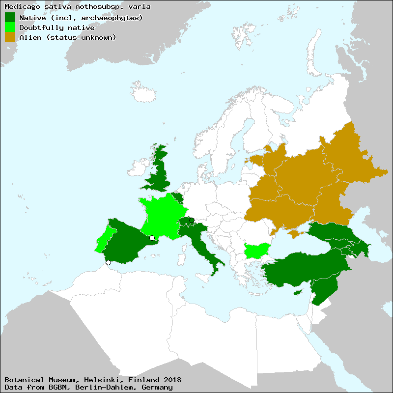 Although of hybrid origin, treated as a subspecies on account of its, goodseparate species, Gruzia and subsp. medidaghestanica Sinskaya from Dagestan & Gruzia, In "Flora Kazakhstana" M. ochroleuca & M. rivularis are recognized as, independent existence in many localities., M.varia is a hybrid between M.falcata & M.sativa., S.Czerepanov (1973, 1981) recorded subsp. loriensis Sinskaya from Armenia &, This species is a hybrid between M. falcata & M. sativa |