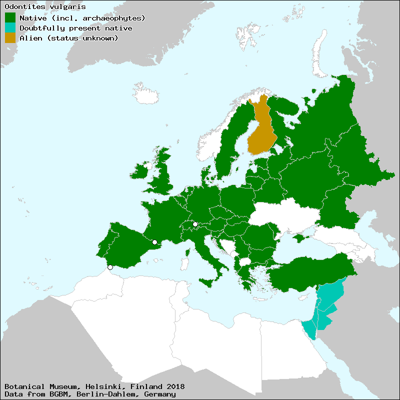 Marhold, K. (2011+): Odontites. – In: Euro+Med Plantbase - the information resource for Euro-Mediterranean plant diversity. This work is licensed under a Creative Commons Attribution-ShareAlike 3.0 Unported license (CC-By-SA-3.0 Unported).