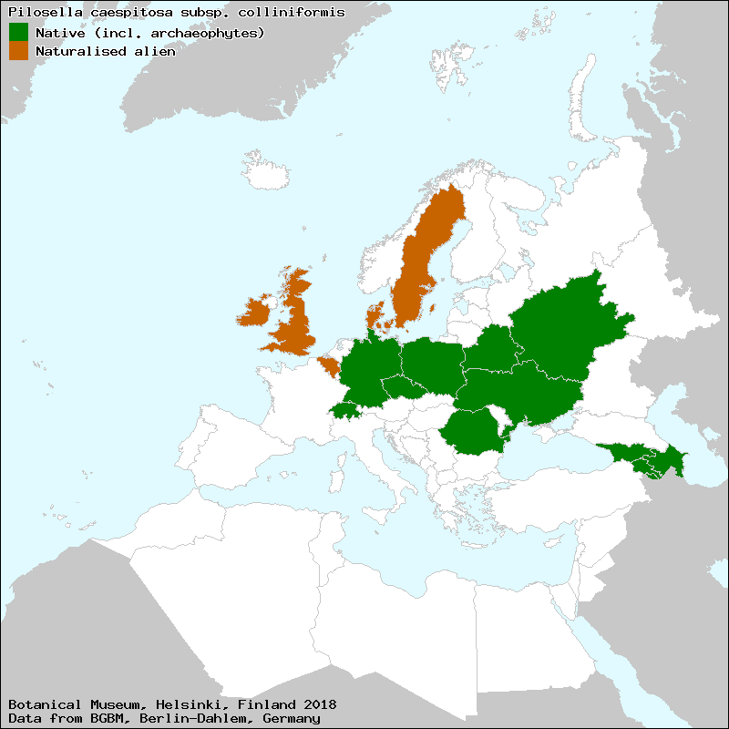 Bräutigam, S. & Greuter, W. (2007-2009): Pilosella. – In: Greuter, W. & Raab-Straube, E. von (ed.): Compositae. Euro+Med Plantbase - the information resource for Euro-Mediterranean plant diversity. This work is licensed under a Creative Commons Attribution-ShareAlike 3.0 Unported license (CC-By-SA-3.0 Unported).