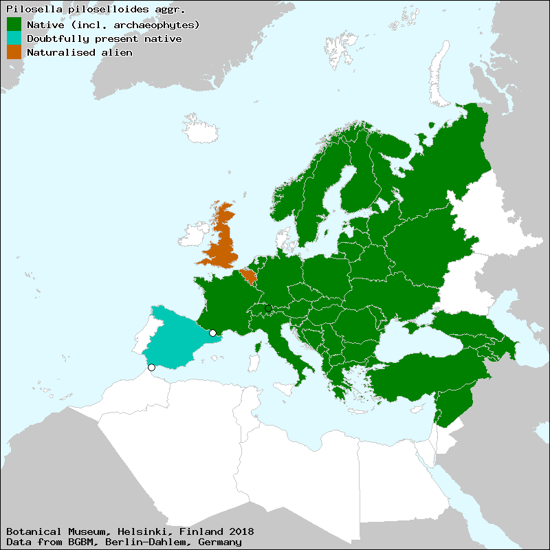 Source: Bräutigam, S. & Greuter, W. (2007-2009): Pilosella. – In: Greuter, W. & Raab-Straube, E. von (ed.): Compositae. Euro+Med Plantbase - the information resource for Euro-Mediterranean plant diversity.