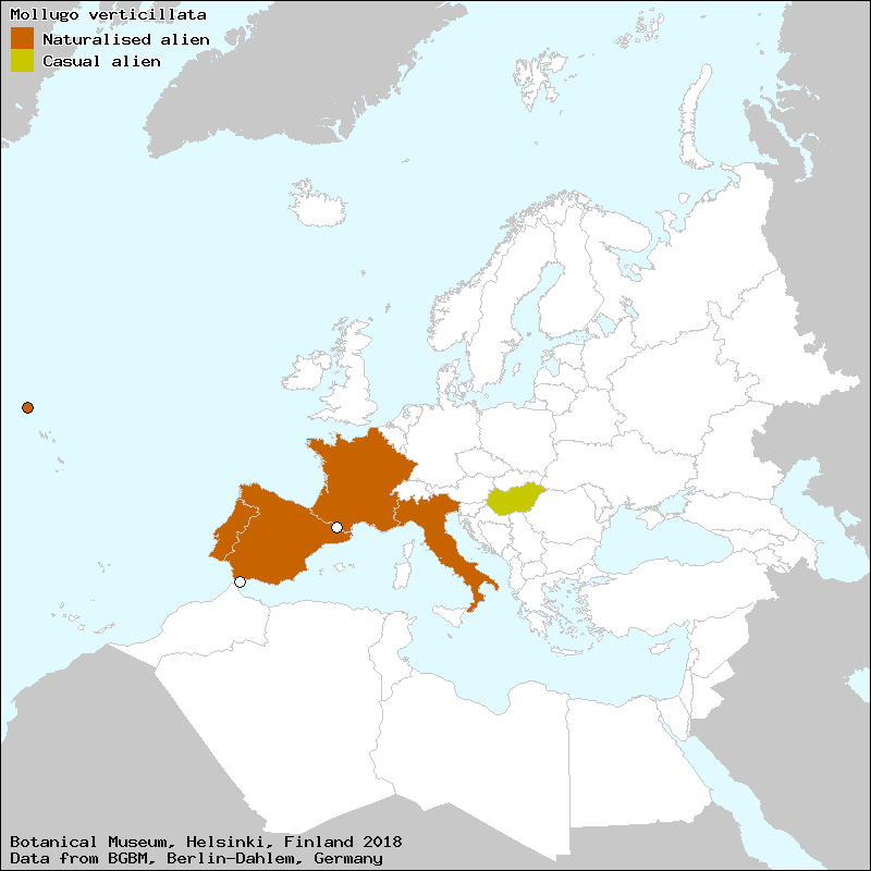 Uotila, P. (2011): Molluginaceae. – In: Euro+Med Plantbase - the information resource for Euro-Mediterranean plant diversity. This work is licensed under a Creative Commons Attribution-ShareAlike 3.0 Unported license (CC-By-SA-3.0 Unported).