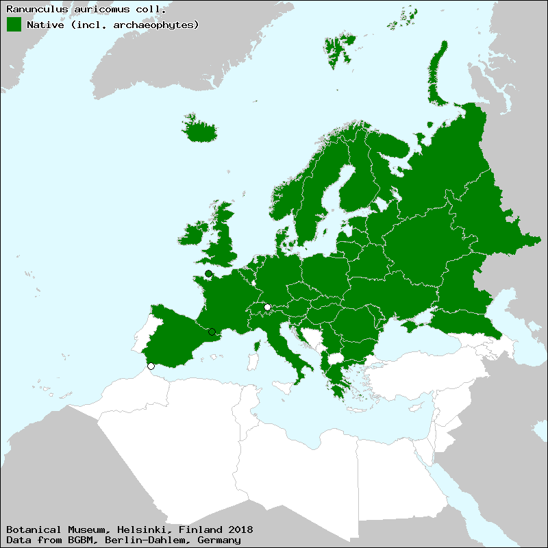 "Ranunculus auricomus" sec. Preston, C. D. et al. (eds. ) - New Atlas of the British & Irish Flora Oxford 2002. |