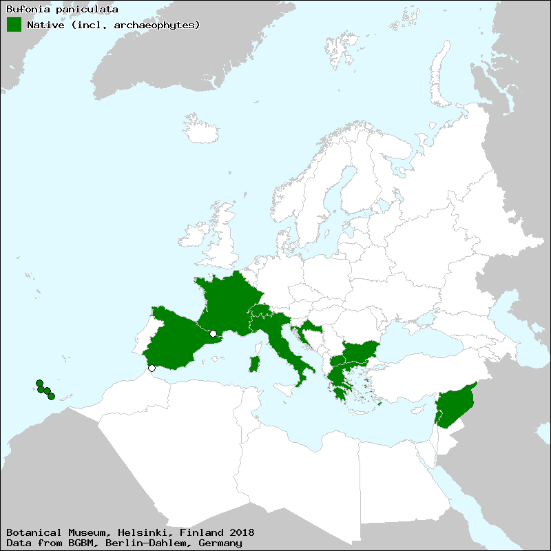 Buffonie à grosses graines (French), Buffonie en panicules (French), Buffonia paniculata (Italian), Buffonie (German), Buffonie paniculée (French), Bufonie à grosses graines (French), Bufonie paniculée (French), metličasta bufonija (Croat), Βουφφονία η φοβοειδής (Greek)[Credits] |