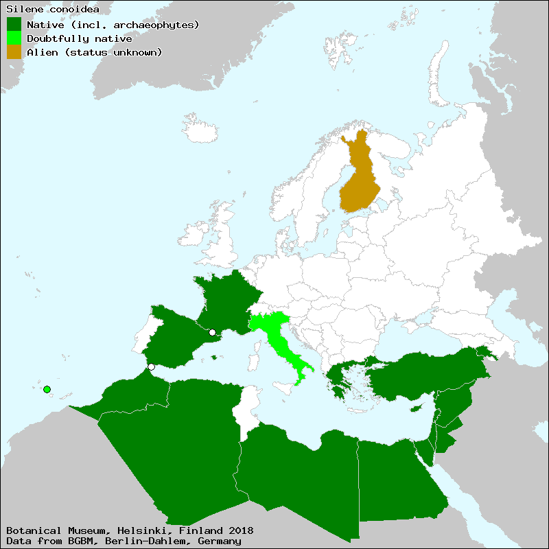 Common names: Silène conoïde (French), צִפָּרְנִית מְחֹרֶטֶת (Israel (Hebrew)), kartikohokki (Finnish), kvarnglim (Swedish), møllesmelle (Norwegian), silene conoide (Catalan), Конусвари гоюнгулағы (Azerbaijani)[Credits]