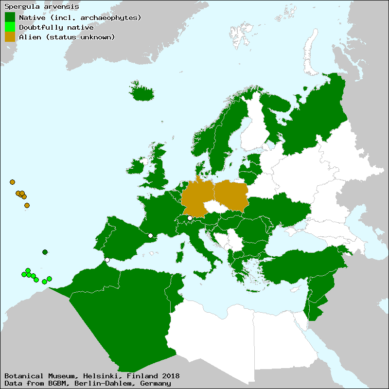 דּוּרִית הַשָּׂדֶה (Israel (Hebrew)), Acker-Spark (German), Acker-Spergel (German), åkerspärgel (Swedish), Almindelig Spergel (Danish), cassamelo (Portuguese), Corrán lín (Irish Gaelic), ekrulínbendil (Faroese), espaguta (Portuguese), esparcela (Galician), esparcilla (Spanish, Castillian), espargura (Portuguese), esparguta (Portuguese), espèrgula (Catalan), espergula (Portuguese), espérgula (Portuguese), espèrgula de camp (Catalan), etelänpeltohatikka (Finnish), foderspärgel (Swedish), Foder-Spergel (Danish), fourrage-de-disette (French), Gewone spurrie (Dutch), gorga (Galician), gorga (Portuguese), Hrana vacii (Roumanian), jättesärgel (Swedish), kolenec najväčší (Slovak), kolenec rolní (Czech), kolenec rolní Inový (Czech), kolenec rolní největší (Czech), kolenec rolní pravý (Czech), kolenec rolní setý (Czech), kolenec roľný (Slovak), linbendel (Norwegian), liño de raposo (Galician), linspärgel (Swedish), Mezei csibehúr (Hungarian), Njivski oklast (Slovene), orga (Portuguese), pèl de boc (Catalan), pèl de boc (Valencian), pellavahatikka (Finnish), peltohatikka (Finnish), pohjanpeltohatikka (Finnish), poljska koljenika (Croat), Renaiola comune (Italian), Renajola (Italian), rinaghjola (Corsican), skurfa (Icelandic), Spargote des champs (French), Spergola (Italian), Spergula e arës (Albanian), Sporek polny (Polish), Sporek polny olbrzymi (Polish), Sporek polny typowy (Polish), spörgel (German), Stor Spergel (Danish), storbendel (Norwegian), sydspärgel (Swedish), Troellig yr Ŷd (Welsh), vanlig linbendel (Norwegian), Σπέργκουλα η αρουραία (Greek), Σπέργκουλα η εδώδιμος (Greek), Полска колянка (Bulgarian), торица обыкновенная (Russian), Торицэ обишнуитэ (Moldovian), אספרגולת השדה (Israel (Hebrew))[Credits] |