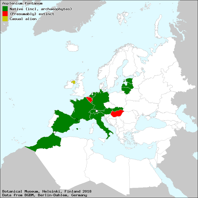 Asplénium des fontaines (French), Jura-Streifenfarn (German), Asplénie des fontaines (French), Asplenio delle fonti (Italian), Asplénium de Haller (French), Asplénium des fontaines (French), culantrillo blanco menor (Spanish, Castillian), Doradille de Haller (French), falguereta (Catalan), falguereta de cingle (Catalan), falgueretas (Spanish, Castillian), Fluhfarn (German), Forrásfodorka (Hungarian), Genaalde streepvaren (Dutch), Hallers Streifenfarn (German), Jura-Streifenfarn (German), Quell-Streifenfarn (German), Slezinník skalný (Slovak)[Credits] |