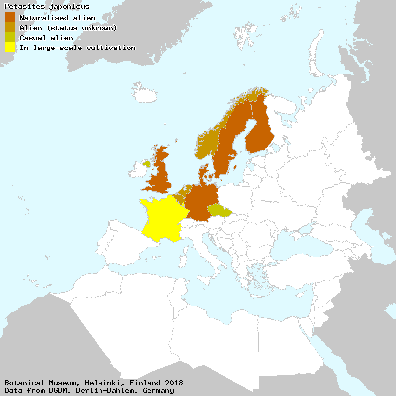 Bitterskråp (Swedish), Devětsil japonský (Czech), Japanpestrot (Norwegian), Japans hoefblad (Dutch), Japansk Hestehov (Danish), Japaninruttojuuri (Finnish)[Credits] |
