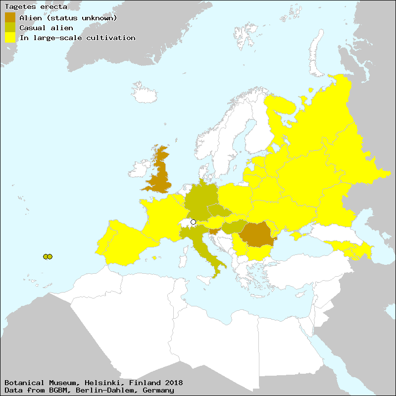 Aksamitka wzniesiona (Polish), Rose d’Inde (French), Rumena žametnica (Slovene), Бархотка прямостоячая (Russian), Выздоажэ еректэ (Moldovian), Дүзгалхан сабаһҝүлү (Azerbaijan), Чорнобривцi прямостоячi (Ukraine), clavaller de moro (Majorcan), clavel de las Indias (Spanish, Castillian), clavell d´agost (Catalan), clavell d´Índia (Catalan), clavell de moro (Catalan), clavell de moro (Majorcan), clavell de mort (Catalan), clavell de mort (Majorcan), clavellina de huerto (Spanish, Castillian), clavellina real (Spanish, Castillian), clavelón (Spanish, Castillian), copete (Spanish, Castillian), copetes (Spanish, Castillian), cravo da India (Portuguese), cravo de defuncto (Portuguese), cravo fetido da India (Portuguese), cravo-da-India (Portuguese), cravo-de-defuntos (Portuguese), cravo-fétido-da-India (Portuguese), flor de muerto (Spanish, Castillian), pomposas (Majorcan), rosa d´agost (Catalan), rosa-de-oiro (Portuguese), Повняки (Ukraine), Циганкуцэ (Moldovian)[Credits] |
