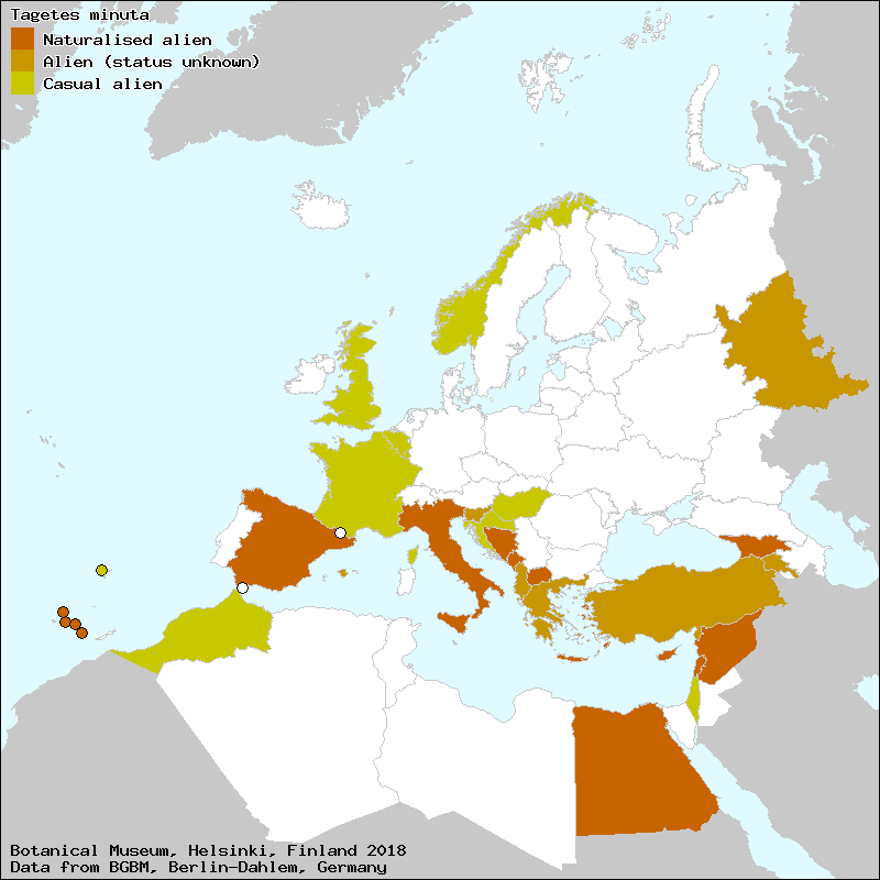 Divja žametnica (Slovene), Geelgroen afrikaantje (Dutch), Lulekadife (Albanian), Tagète des décombres (French), Tagete puzzolente (Italian), טגטס קטן (Israel (Hebrew)), טָגֶטֶס קָטָן (Israel (Hebrew)), تاجِسِيَّة صُغَيِّرَة (Arabic), camamil.la americana (Catalan), camamilla americana (Catalan), camamilla americana (Spanish, Castillian), chinchilla (Spanish, Castillian), comí (Catalan), comí d´Amèrica (Catalan), herba pudent (Valencian), menta americana (Catalan), menta americana (Spanish, Castillian), menta d´Amèrica (Catalan), milfulles (Catalan), te pudent (Catalan), te pudent (Valencian)[Credits] |