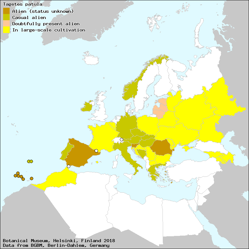 Aksamitka rozpierzchła (Polish), Fratrići (Croat), Garofal žuti (Croat), Gewöhnliche Samtblume (German), Gromniščica (Croat), Kadifica (Croat), Konavljanin (Croat), Oeillet d’Inde (French), Rjavkasta žametnica (Slovene), Studentenblume (German), Tagete comune (Italian), Žutjelj mali (Croat), Бархотка развесистая (Russian), Выздоажэ патулатэ (Moldovian), Чорнобривцi розлогi (Ukraine), Шахәли сабаһҝүлү (Azerbaijan), ballutets (Portuguese), canicuba (Spanish, Castillian), clavaller de moro (Majorcan), clavel de la India (Spanish, Castillian), clavel de las Indias (Spanish, Castillian), clavel de muerto (Spanish, Castillian), claveles turcos (Asturian), clavell de mora (Portuguese), clavell de moro (Catalan), clavell de moro (Majorcan), clavell de moro (Portuguese), clavell de mort (Majorcan), clavellina plegada (Spanish, Castillian), clavellina rizada (Spanish, Castillian), copetillo (Spanish, Castillian), copetito (Spanish, Castillian), cravo de defuncto (Portuguese), cravo de defunto (Portuguese), cravo de Tunes (Portuguese), damasquina (Catalan), damasquina (Spanish, Castillian), escopetón (Spanish, Castillian), escopetones (Spanish, Castillian), flores de muerto (Spanish, Castillian), pomposas (Majorcan), Razprostrta žametnica (Slovene)[Credits] |