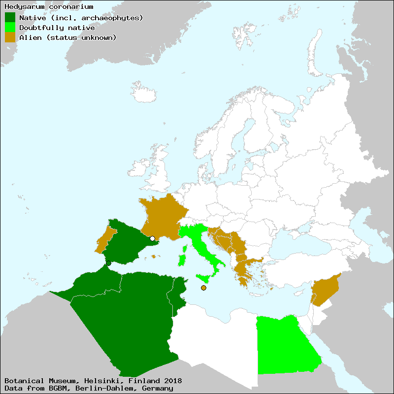 coronaria (L.)Medikus)., In Kumar & Sane (2003) treated as separate genus: Sulla Medicus (Sulla, Native to the Mediterranean region., No herbarium specimens exist, but Bojer mentions this species as cultivated at, the gardens, Mauritius. |