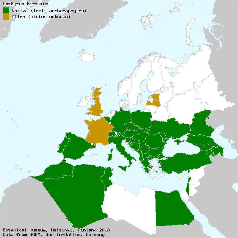 Caley Pea (English), chícharo-verrucoso (Portuguese), China Shershavaya (Russian), China Zhestkovolosistaya (Russian), Gesse Herissee (French), guija velluda (Spanish, Castillian), guixó hirsut (Catalan), Hairy Vetchling (English), Rauhhaarige Platterbse (German), Rough Pea (English), Singletary Pea (), Sochevichnik Zhestkovolosistyi (Russian)[Credits] |