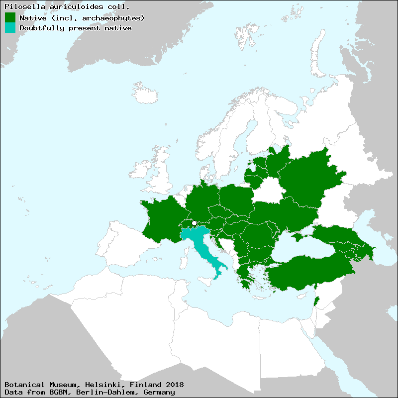Bräutigam, S. & Greuter, W. (2007-2009): Pilosella. – In: Greuter, W. & Raab-Straube, E. von (ed.): Compositae. Euro+Med Plantbase - the information resource for Euro-Mediterranean plant diversity. This work is licensed under a Creative Commons Attribution-ShareAlike 3.0 Unported license (CC-By-SA-3.0 Unported).