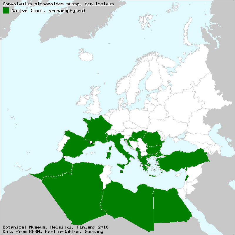 "Convolvulus althaeoides" sec. JORDANOV, D. (ed.) - Flora na Narodna Republika Balgarija. Izdatelstvo na Balgarskata akademija na naukite, Sofija, 1963-... 1: [1]-507. 1963, 2: [1]-423. 1964; 3: [1]-637. 1966; 4: [1]-748. 1970; 5: [1]-442. 1973; 6: [1]-590. 1976; 7: [1]-529. 1979; 8: [1]-518. 1982-... |