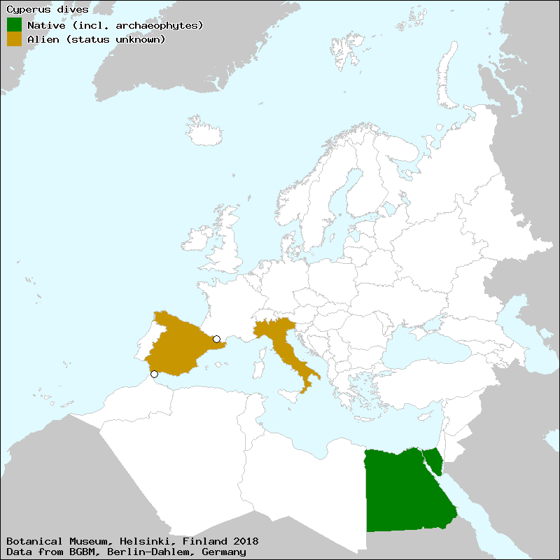 "Cyperus exaltatus" sec. Verloove, F. (2014) - A conspectus of Cyperus s.l. (Cyperaceae) in Europe (incl. Azores, Madeira and Canary Islands), with emphasis on non-native naturalized species - Webbia 69: 179-223.