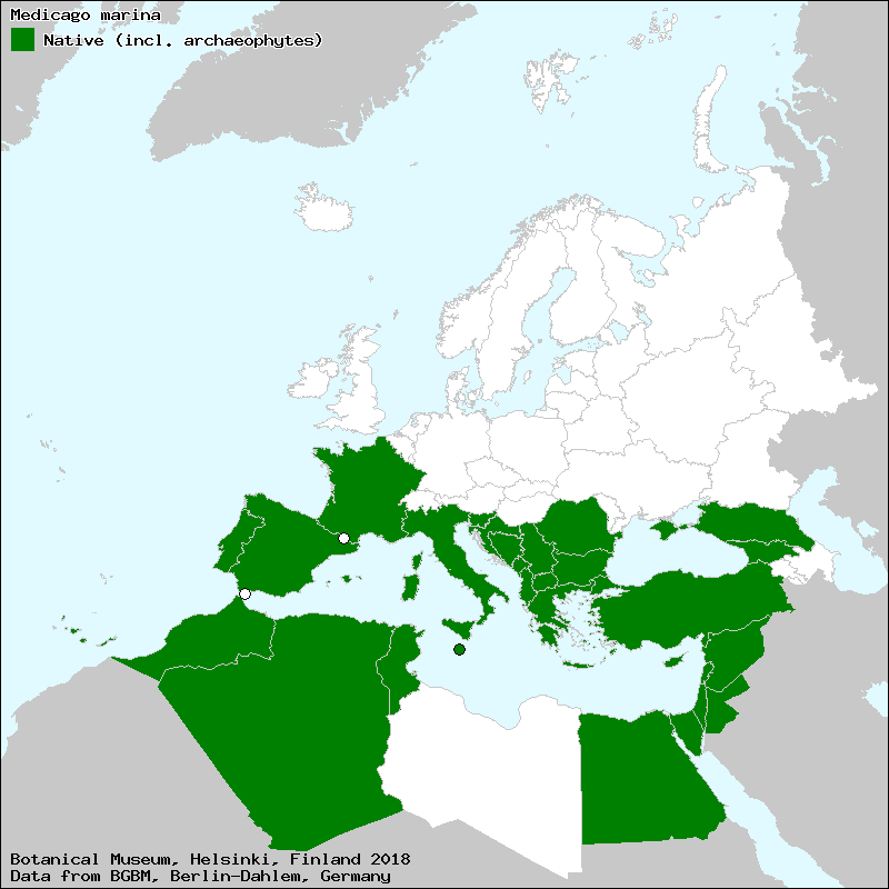 alfalç marí (Catalan), alfals marí (Catalan), alfals marí (Valencian), carretón de playa (Spanish, Castillian), carretones (Spanish, Castillian), Coastal Medick (English), erva-cordeira (Portuguese), erva-das-areias (Portuguese), erva-do-perdao (Portuguese), hierba de la plata (Spanish, Castillian), lucerna das praias (Galician), luzerna das praias (Galician), luzerna das praias (Portuguese), luzerna-das-areias (Portuguese), luzerna-das-praias (Portuguese), Lyutzerna Primorskaya (Russian), meiga de mar (Galician), melga da praia (Portuguese), melga de mar (Galician), melga-da-praia (Portuguese), melgó marí (Catalan), mielga boyuna (Spanish, Castillian), mielga marina (Spanish, Castillian), Sea Medick (English), trébol marino (Spanish, Castillian), trèvol marí (Catalan), trèvol mari (Majorcan)[Credits] |