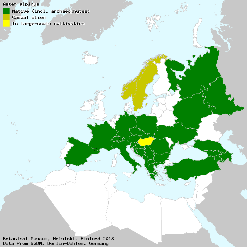 Alpaster (Swedish), Alpen-Aster (German), Alpska nebina (Slovene), Aster alpejski (Polish), Aster alpin (Albanian), Aster des Alpes (French), Astra alpínska (Slovak), Astro alpino (Italian), Hvězdnice alpská (Czech), Айстра альпiйська (Ukraine), Алп астер (Azerbaijan), Алпийски звездел (Bulgarian), Астра альпийская (Russian), Աստղածաղիկ ալպիական (Armenian), aster (Spanish, Castillian), àster alpí (Catalan), manzanilla de pastor (Spanish, Castillian)[Credits] |