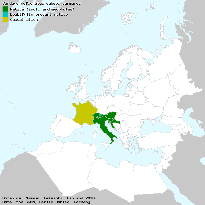 "Carduus defloratus subsp. defloratus" sec. Tutin, T. G., Heywood, V. H., Burges, N. A., Valentine, D. H., Walters, S. M. & Webb, D. A. - Flora europaea 1-5 Cambridge University Press Cambridge 1964-1980. |
