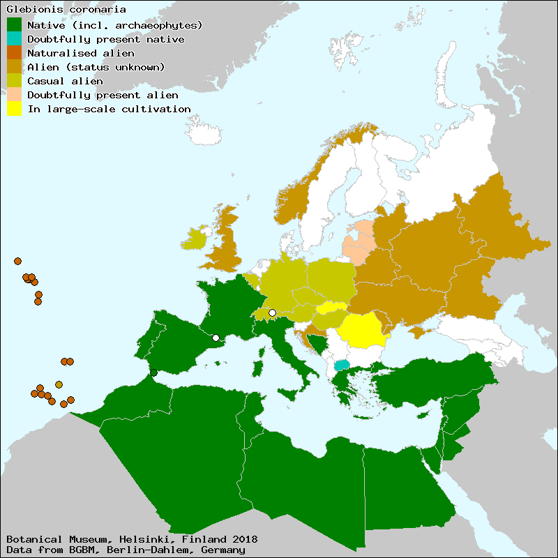 Balculu (Corsican), Chrysanthème à couronnes (French), Chrysanthème couronné (French), Chrysanthème des jardins (French), Chryzantémovka vencová (Slovak), Crisantemo giallo (Italian), Crown Daisy (English), Fior d’oro (Italian), Kranskrage (Swedish), Kronkrage (Norwegian), Kron-Okseøje (Danish), Kruunupäivänkakkara (Finnish), Lellux (Maltese), Zelenkasti ravan (Croat), Żigland (Maltese), Złocień wieńcowy (Polish), Златоцвет обыкновенный (Russian), Златоцвет увенчанный (Russian), Кризантеме коронатэ (Moldovian), Хризантема увiнчана (Ukraine), אזנן משולשן (Israel (Hebrew)), חַרְצִית עֲטוּרָה (Israel (Hebrew)), قَوْقَحان إكْليلي (Arabic), antimonia (Spanish, Castillian), beijos-de-estudante (Portuguese), belide menuda (Spanish, Castillian), bemmequeres (Portuguese), bemmequeres amarello (Portuguese), besantemon oloroso (Spanish, Castillian), bolits (Majorcan), bolitx (Majorcan), bòlitz (Majorcan), bulitx (Majorcan), camamilla borda (Majorcan), coronària (Catalan), coronaria (Spanish, Castillian), crisantem (Catalan), crisantemo (Galician), crisantemo (Spanish, Castillian), crisantemo silvestre (Spanish, Castillian), crisantemos (Portuguese), estrella española (Spanish, Castillian), estrella mayor de mieses (Spanish, Castillian), flor de muerto (Spanish, Castillian), flor de santo (Spanish, Castillian), hinojo hato (Spanish, Castillian), krisantemo (Euskera), magarza (Spanish, Castillian), magarzón (Spanish, Castillian), magaza (Spanish, Castillian), malmequer (Portuguese), malmequeres amarello (Portuguese), manzanilla de flor dorada (Spanish, Castillian), manzanilla dulce (Spanish, Castillian), manzanilla loca (Spanish, Castillian), maravellas (Majorcan), margarida (Catalan), margarida silvestre (Catalan), margarides (Majorcan), margaritones (Spanish, Castillian), meravelles (Catalan), mirabeles (Spanish, Castillian), mirabels (Spanish, Castillian), mogigato (Spanish, Castillian), mohinos (Spanish, Castillian), mohinos bastos (Spanish, Castillian), moixos (Catalan), moixos (Majorcan), mojigato (Spanish, Castillian), mojino amarillo (Spanish, Castillian), ojo de buey (Spanish, Castillian), ojos albillos (Spanish, Castillian), ollo de boi (Galician), pajito (Spanish, Castillian), pajitos (Spanish, Castillian), pampilho (Portuguese), pampilho ordinario (Portuguese), pampilho ordinário (Portuguese), pampilho-ordinário (Portuguese), pampillo (Galician), pamposto (Portuguese), pampullo (Galician), paxitos (Spanish, Castillian), rot de bou (Catalan), santimonia (Spanish, Castillian), semillama (Spanish, Castillian), sordanaia (Majorcan), sordanara (Majorcan), sordanaya (Majorcan), sordonaia (Catalan), ull de bou (Catalan), urrelili (Euskera), violer de mort (Majorcan), yerba del muerto (Spanish, Castillian)[Credits] |