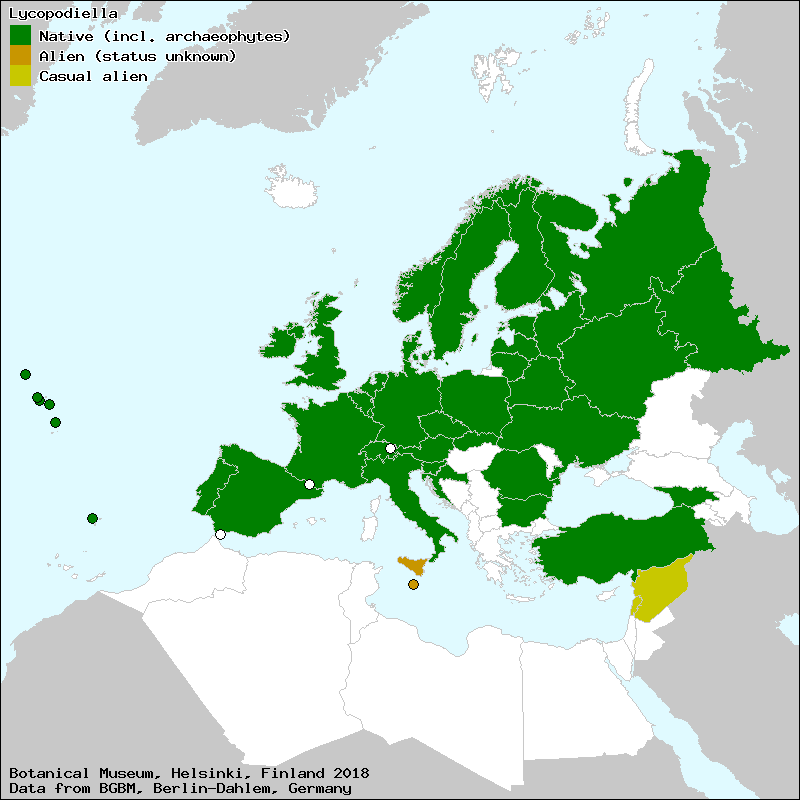 Christenhusz, M. & Raab-Straube, E. von (2013): Lycopodiophytina. – In: Euro+Med Plantbase - the information resource for Euro-Mediterranean plant diversity. This work is licensed under a Creative Commons Attribution-ShareAlike 3.0 Unported license (CC-By-SA-3.0 Unported).