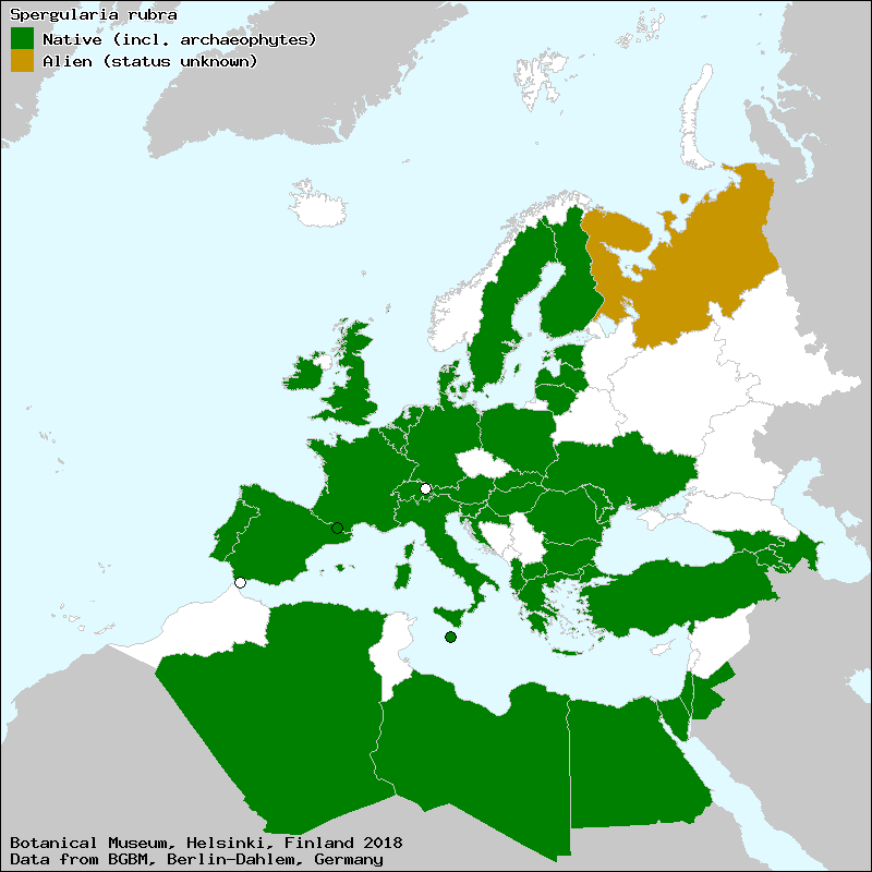 Spergulaire de Catalogne (French), Spergulaire rouge (French), אֶפְזָרִית אֲדֻמָּה (Israel (Hebrew)), arenaria (Majorcan), arenária (Portuguese), arenaria roja (Spanish, Castillian), arenaria vermella (Galician), ariñondoko (Euskera), ausina rocha (Valencian), Cabróis dhuimhche (Irish Gaelic), crvena koljenčica (Croat), esparcilla encarnada (Spanish, Castillian), espergularia (Spanish, Castillian), espergulària vermella (Catalan), herba bermella (Valencian), herba pasarella (Catalan), herba paserella (Catalan), herba passarella (Catalan), herba passarellera (Catalan), herba passarellera (Portuguese), herba passerella (Catalan), herba vermella (Catalan), herba vermella (Portuguese), herba vermeya (Majorcan), hierba bermeja (Spanish, Castillian), hierba de la golondrina (Spanish, Castillian), kuřinka červená (Czech), Lupinaia (Italian), Mark-Hindeknæ (Danish), Muchotrzew polny (Polish), pakolenec červený (Slovak), Piros budavirág (Hungarian), planta de la diarrea (Spanish, Castillian), Punane sõlmhein (Estonian), punasolmukki (Finnish), rabaniza de los soseros (Spanish, Castillian), rausvoji posmiltė (Lithuanian), Rdeča nitnica (Slovene), Rode schijnspurrie (Dutch), rödnarv (Swedish), rompepiedra (Spanish, Castillian), rompepiedras (Spanish, Castillian), Rote Schuppenmiere (German), Roten Schuppenmiere (German), rožainais pagaurs (Latvian), Sabline rouge (French), salvaillo (Spanish, Castillian), sapinho roxo (Portuguese), sapinho-roxo (Portuguese), Spergola (Italian), Spergulaire rouge (French), Spergularia comune (Italian), Spergularia e kuqe (Albanian), Troellys Coch (Welsh), tunbendel (Norwegian), vermella (Spanish, Castillian), Σπεργκουλάρια η ερυθρά (Greek), торичник красный (Russian), Червена коленчица (Bulgarian), Чөл ҹинҹилә (Azerbaijani), אספרגולריה אדומה (Israel (Hebrew))[Credits] |