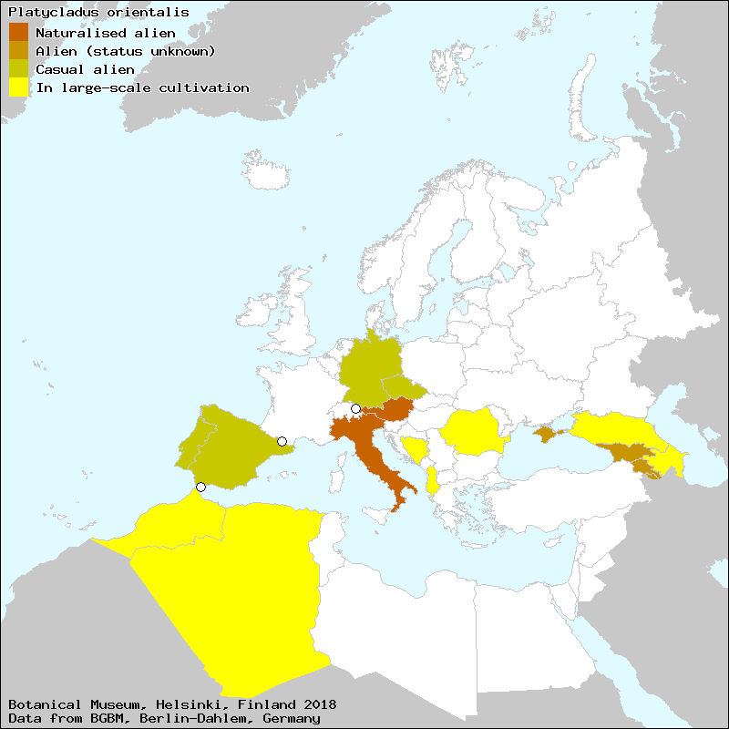 árbol de la vida (Spanish, Castillian), árbol de la vida chino (Spanish, Castillian), arbre de la vida (Catalan), arbre de la vida (Majorcan), biota-da-China (Portuguese), cedro palmar (Portuguese), ciprés de abanico (Spanish, Castillian), ekialdeko tuia (Euskera), Lebensbaum (German), Mazi (Turkish), thiino de Oriente (Portuguese), thuia de Oriente (Portuguese), thya de Oriente (Portuguese), tuia (Catalan), tuia (Majorcan), tuia-da-china (Portuguese), tuya (Spanish, Castillian), tuya oriental (Spanish, Castillian), xiprer de ventall (Catalan), xiprer de ventall (Majorcan)[Credits] |