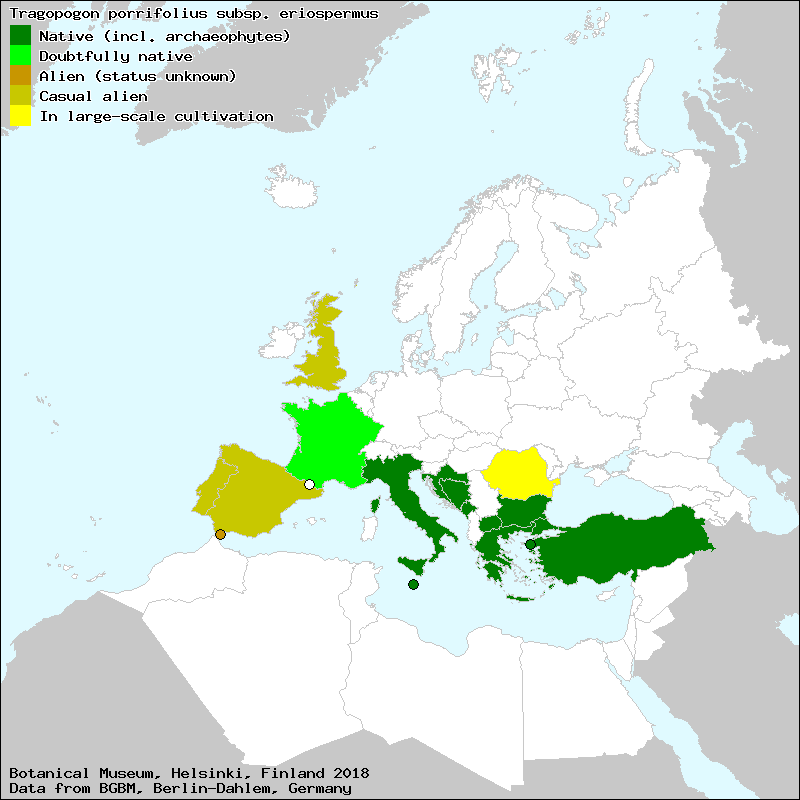"Tragopogon porrifolius subsp. porrifolius" sec. Greuter, W. & Raus, T. (2007) - Med-Checklist notulae, 25 - Willdenowia Berlin-Dahlem 37: 205-213. |
