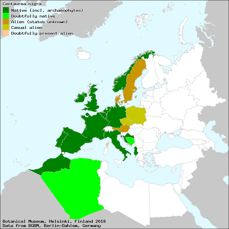 Centaurée noire (French), Chaber ciemny (Polish), Chrpa černá (Czech), Common Knapweed (English), Crna zečina (Croat), Crnoresa zečina (Croat), Fiordaliso scuro (Italian), Kokoçel i zi (Albanian), Mustakaunokki (Finnish), Schwarze Flockenblume (German), Sorthoved-Knopurt (Danish), Svartklint (Swedish), Svartknoppurt (Norwegian), Василек черный (Russian), aciano negro (Spanish, Castillian), cañamones (Spanish, Castillian), Chrpina černá (Czech), garabanzos (Asturian), garampayu (Asturian), garbanzón (Asturian), manzorru (Asturian)[Credits] |