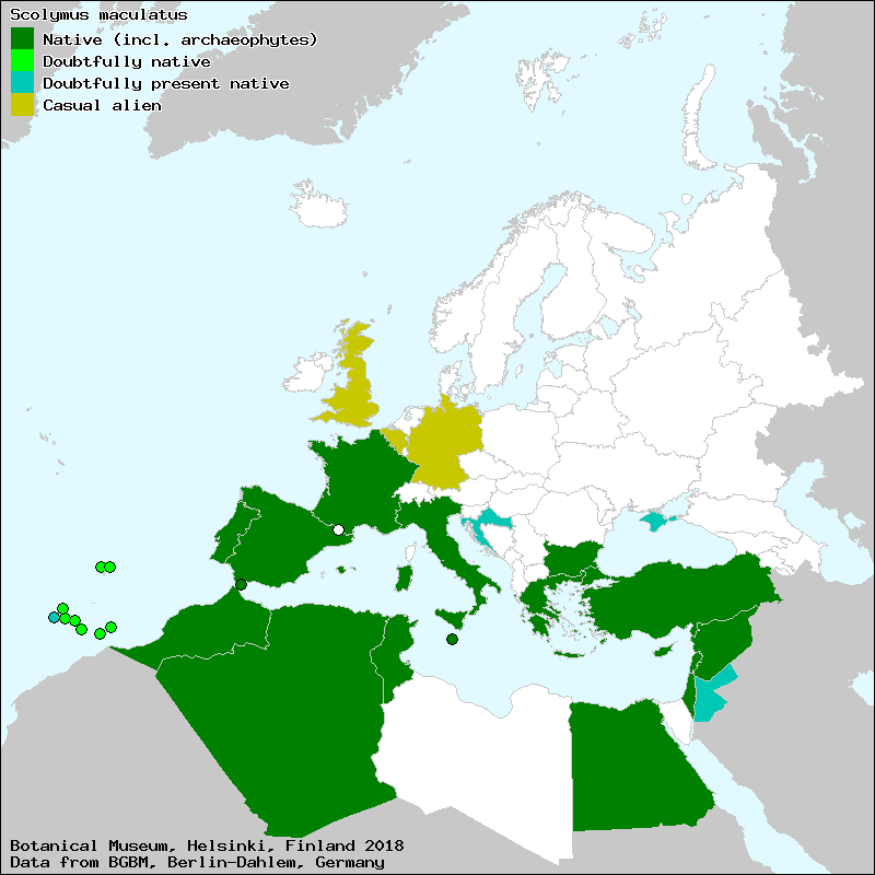 Cardogna macchiata (Italian), Scolyme taché (French), Taggfibbla (Swedish), Xewk isfar (tar-riga bajda) (Maltese), Петнист сколимус (Bulgarian), Сколiмус плямистий (Ukraine), חוֹחַ עָקֹד (Israel (Hebrew)), חוח עקוד (Israel (Hebrew)), سْكوليمُس مُبَقَّع (Arabic), cardets bords (Valencian), cardillo (Spanish, Castillian), cardillos (Spanish, Castillian), cardillos de comer (Spanish, Castillian), cardo borriquero (Spanish, Castillian), cardo de olla (Spanish, Castillian), cardo manchado (Spanish, Castillian), cardo perruno (Spanish, Castillian), catalina (Majorcan), catalinoia (Catalan), catalinoia (Majorcan), catalinoia (Valencian), catalinoya (Majorcan), dent de ca (Catalan), dent de ca (Majorcan), diente de perro (Spanish, Castillian), escólimo malhado (Portuguese), escólimo-malhado (Portuguese), escolymo malhado (Portuguese), kardantxo (Euskera), tagardina (Spanish, Castillian), tagardinas (Spanish, Castillian), tagarmina (Spanish, Castillian), tagarnina (Spanish, Castillian), tagarninas (Spanish, Castillian)[Credits] |