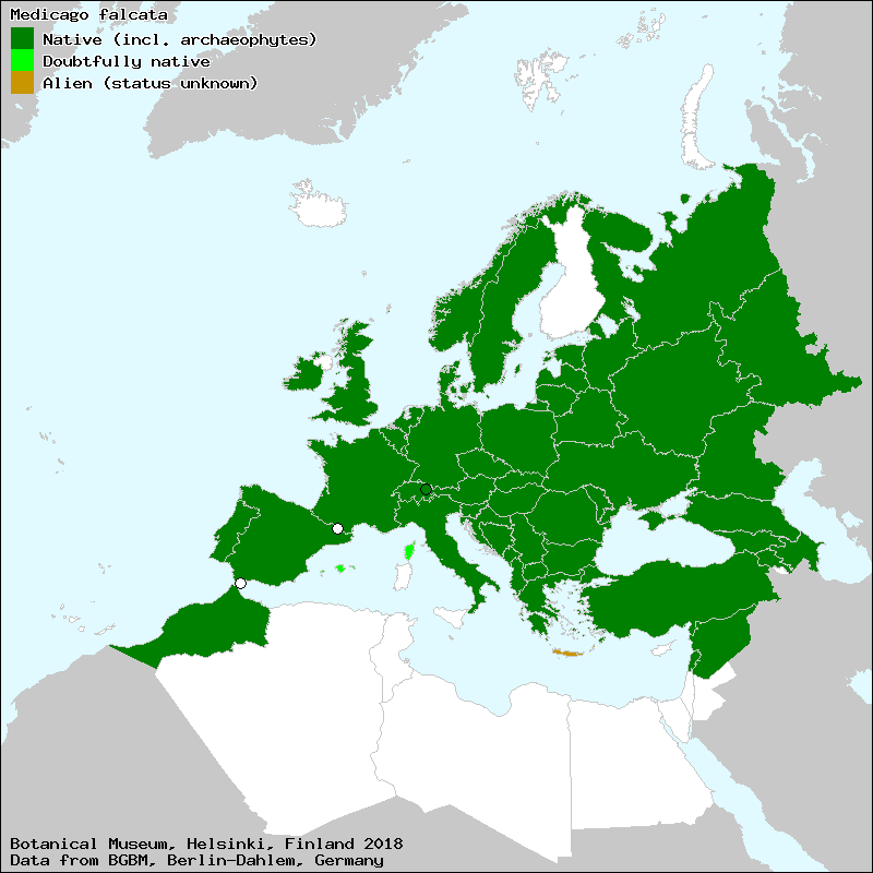 Alien to Leningrad Province: near Gatchina, Caucasus. In "Flora Kavkaza" var. pubescens (Rouy et Foucaud)Grossh., Close to M. falcata, Conservation status "Nationally scarce but not in IUCN category" in UK., Doubtfully present in Cyprus, Algeria & Libya, Endemic to Caucasus, Endemic to Eastern European Province by A.L.Takhtajan, Europe, var. pygmaea Sumn. from W. Siberia, var. ramosissima Sumn. fromW., from Moldavia & S. Ukraine, var. suffruticosa Grossh. from Caucasus,var., from W. Transcaucasia, var. suffruticosa Grossh. from Central Caucasus & var., Highly variable taxon Vassilcz. from Tien-Shan, var. lasiagrostidetorum, Highly variable taxon., In "Flora Partis Europaeae URSS" this taxon is treated as M. falcata var., mongholica Sumn. from N.W. Mongolia, var. orientalis Sumn. from Altai, var., Mongolia, var. revoluta Sumn. from W. Siberia, var. sophiae (Bosser)Grossh., Of economic importance as a parent of M.sativa subsp.x varia, parviflora Grossh. from Pribalkhashie, var. pubescens Rouy et Foucaud from S., quasifalcata as separate species, romanica utv.)Grossh. from E. Europe & W. Siberia, var. lanata Grossh. from, sibirica (Sumn.)Grossh. from W. Siberia & var. viscosa Rchb. from Crimea and, Some authors recognize subsp. polychroa Sinskaya & subsp. praefalcata Sinskaya, Some taxonomists regarded M. borealis, M. procumbens & M., tenella Sumn. from Pribalkhashie, var. tetrabagatica Sumn. from Middle Asia., Ural, var. linifolia (Kushan)Grossh. from S.E. Europe & W. Siberia, var., Vassilcz. from E. Tien-Shan, var. lignescens Sumn. from Tien-Shan, var., viscosa Rchb. from W.Transcaucasia are recognized |