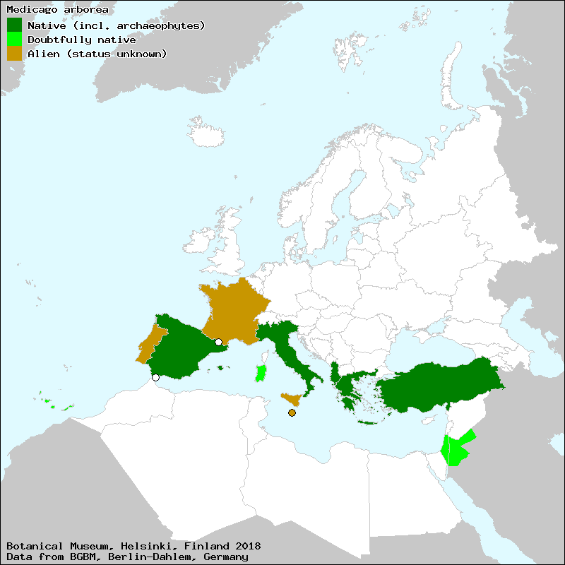 alfalfa arbórea (Spanish, Castillian), alfals arbori (Catalan), alfals arborí (Catalan), alfals-arbre (Majorcan), anfaus-abre (Majorcan), anfaus-arbre (Catalan), aufaus abre (Majorcan), botón de cerdas (Spanish, Castillian), citiso nuevo de España (Spanish, Castillian), luzerna arbórea (Portuguese), luzerna-arbórea (Portuguese), mielga real (Spanish, Castillian), setiso (Spanish, Castillian), Shrub Medick (English), trébol retamal (Spanish, Castillian), Tree Medick (English)[Credits] |