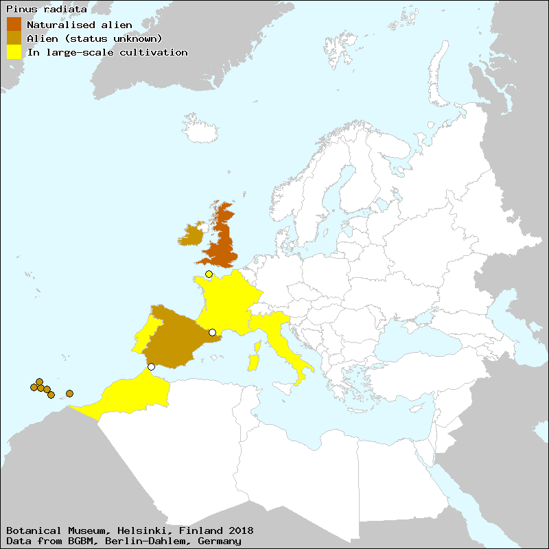 intsinis pinu (Euskera), intsinis pinua (Euskera), pi insigne (Catalan), piñeiro de Monterrei (Galician), piñeiro de repoboación (Galician), piñeiro insigne (Galician), pinheiro-de-monterey (Portuguese), pinheiro-insigne (Portuguese), pino (Asturian), pino (Spanish, Castillian), pino de Monterrey (Spanish, Castillian), pino insigne (Spanish, Castillian), pino insignis (Spanish, Castillian), pino silvestre (Spanish, Castillian), pino volador (Spanish, Castillian), pinua (Euskera)[Credits] |