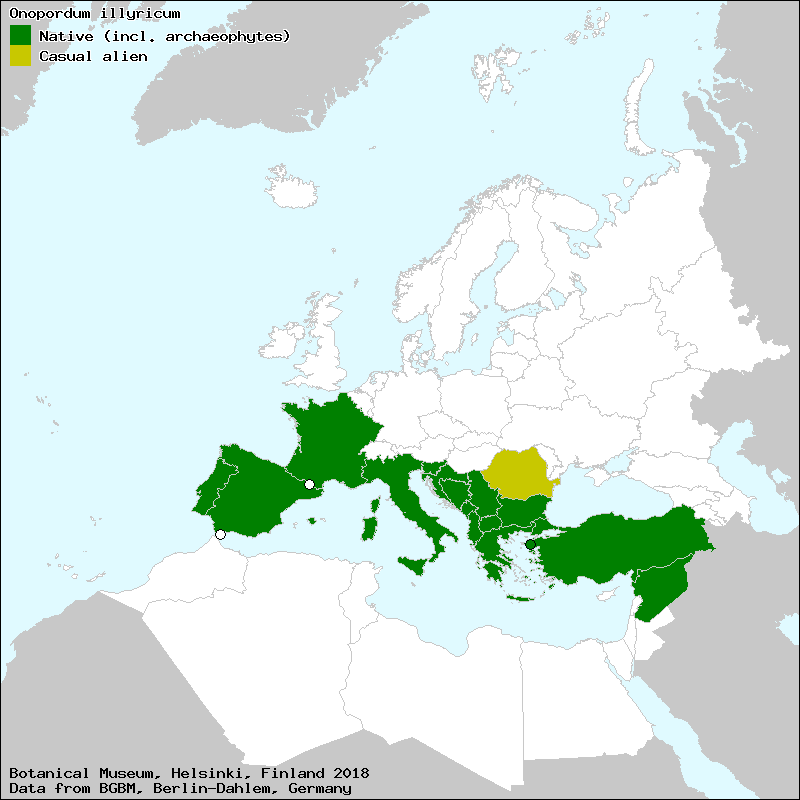 Artićok divji (Croat), Badelj veliki (Croat), Cardu sumerinu (Corsican), Grenig ulltistel (Swedish), Ilirska bodljača (Croat), Ilirska kozjica (Slovene), Ilirski kravačac (Croat), Onoporde d’Illyrie (French), Onopordo maggiore (Italian), Onopordon d’Illyrie (French), Pusteni kravačac (Croat), Xhixhëll ilire (Albanian), Илирийски онопордум (Bulgarian), أَقْسون إلّيرْيا (Arabic), alcachofas silvestres (Spanish, Castillian), arrecata (Spanish, Castillian), arrecate (Spanish, Castillian), bufassa il.lírica (Catalan), butassa (Catalan), card d’ase (Majorcan), card del dimoni (Catalan), card del dimoni (Majorcan), card del dimoni (Valencian), cardiga (Catalan), cardillos (Spanish, Castillian), cardo (Spanish, Castillian), cardo borriqueño (Spanish, Castillian), cardo borriquero (Spanish, Castillian), cardo cabeza de turco (Spanish, Castillian), cardo del demonio (Spanish, Castillian), cardos toberos (Spanish, Castillian), carnera borda (Catalan), cart del dimoni (Majorcan), espina blanca (Catalan), Onoporde d’Illyrie (French), pet d’ase (Catalan), toba (Spanish, Castillian), tobas (Spanish, Castillian)[Credits] |